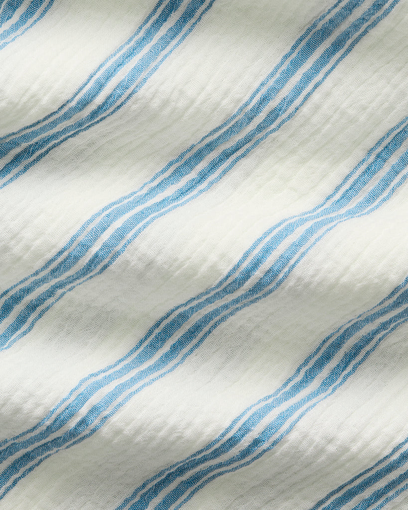 The Finn Drawstring Pant in Dusk Stripe is a refined resort staple, crafted from lightweight crinkle stretch cotton woven in Portugal. Cut with a relaxed leg, the pant features an elasticated waistband with adjustable Japanese cotton cords, finished with silver metal ends. Side pockets add ease and functionality. Style with our Finn Wrap Tunic for a coordinated look, or pair with our designer swimsuits for understated elegance.