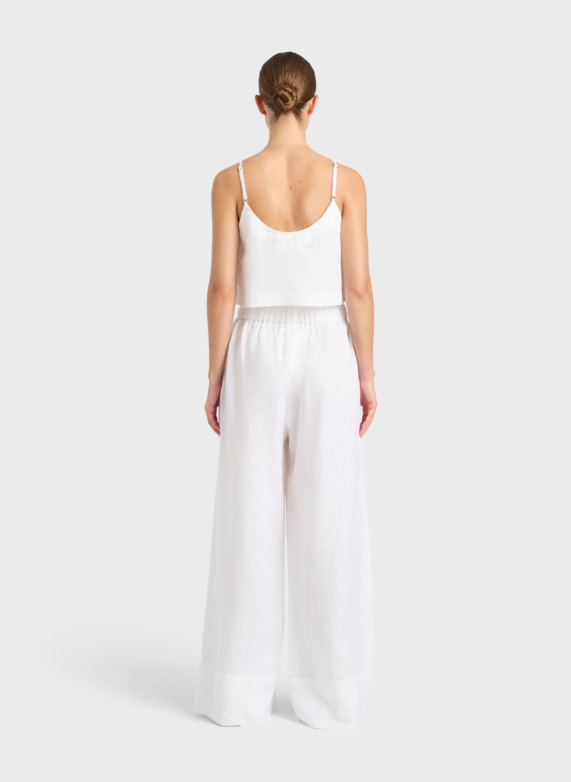 The Leiden Universal Cami in White linen has adjustable shoe-string straps. It flares slightly at the bust and ends at the hips. This classic top is elevated by being cut from our crisp, light weight, 100% organic linen that has been milled by a Masters or Linen™ using European Flax. Make the perfect linen day set by teaming it our Leiden Universal Pant or Leiden Universal Short in white.