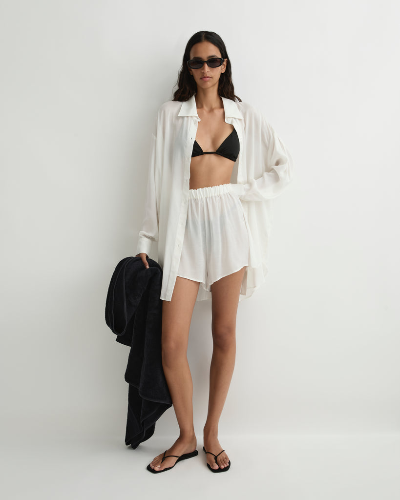 BONDI BORN’s designer cover up shorts reflect the brand’s signature approach to refined, effortless resort wear. Crafted from a lightweight, breathable fabric, these relaxed shorts offer a clean silhouette and fluid movement. Designed to pair seamlessly with swimwear or the matching Cremona oversized shirts, they bring understated elegance to summer dressing.