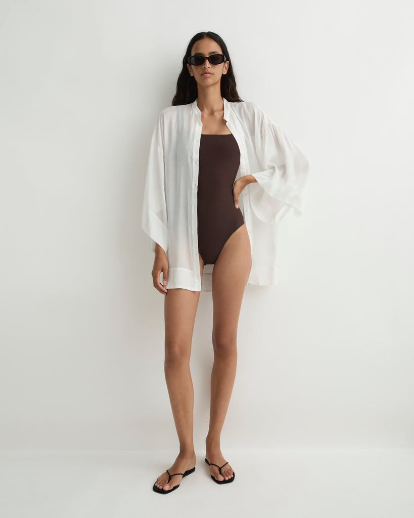 Our Sculpteur® swim fabric has a 3-D stretch that is designed to fit firm. Please size up if between sizes.