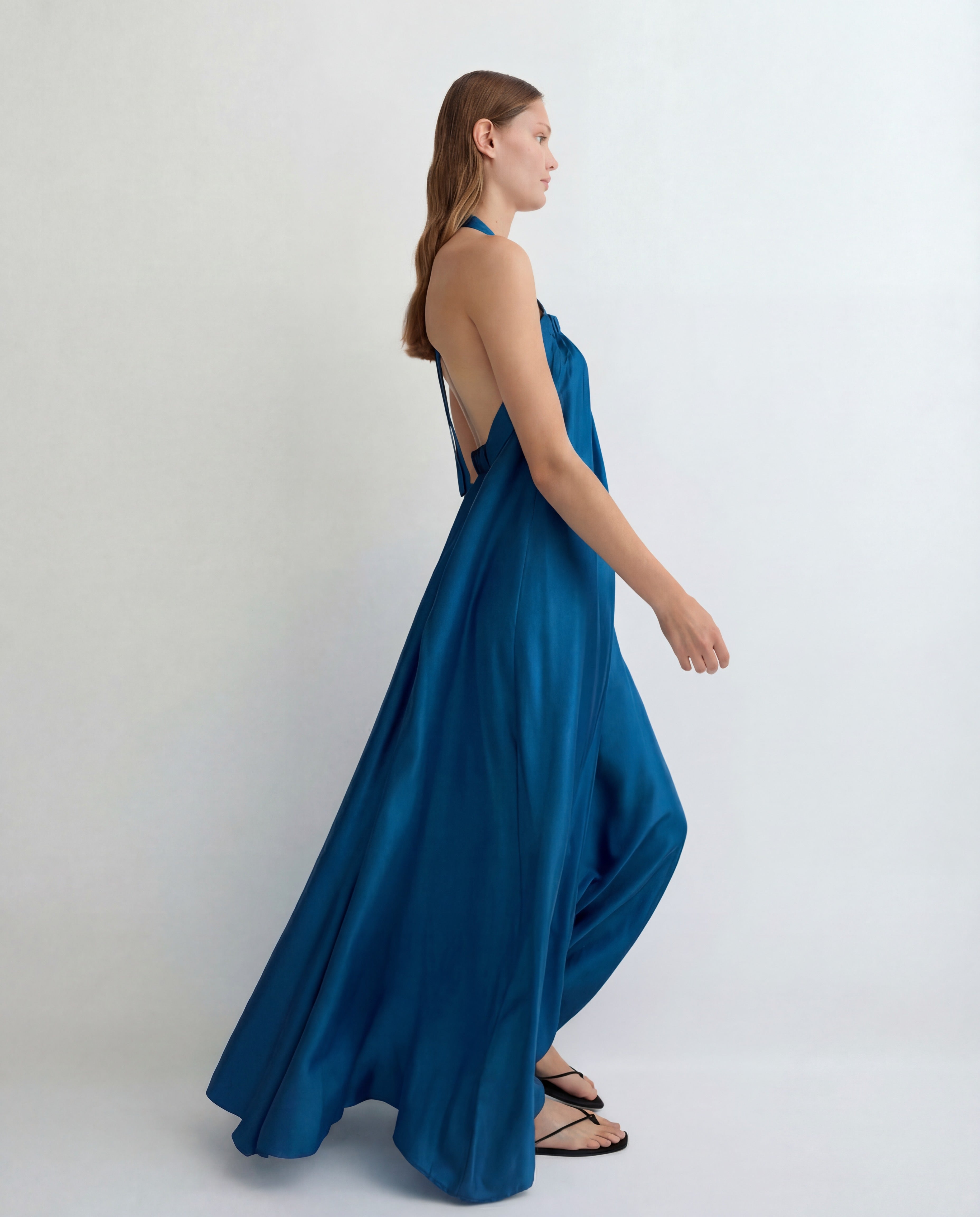 (Tariffs and duties included)The Marfa Halter Maxi Dress in rich Tropico blue is cut from a luxuriously soft 100% silk twill. This effortlessly chic long dress has a long self tie that fastens behind the neck and an encased elastic at the neckline and on the low scooped back to optimise fit. A statement dress with a full skirt that falls to the floor, perfect for special evenings out or for daytime event dressing to weddings and parties.