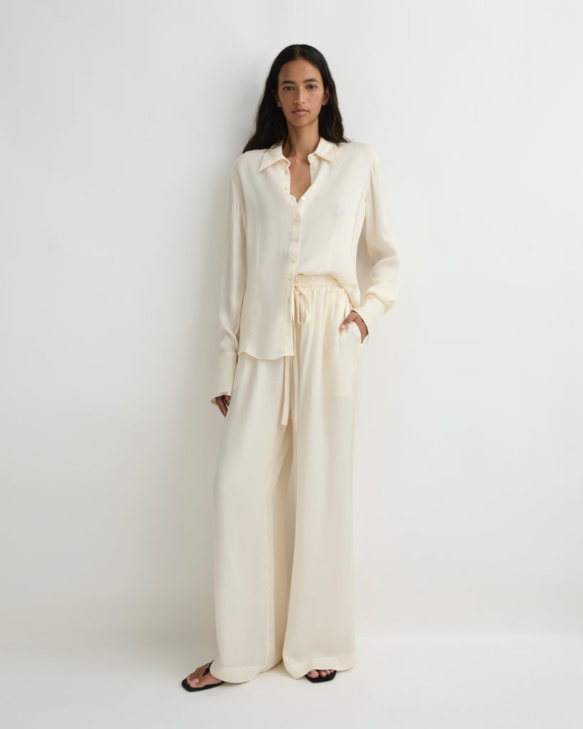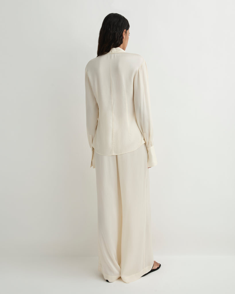 An elevated wardrobe essential, the Ardea Fitted Blouse is crafted from a fluid viscose blend with a lustrous European hammered satin finish. Its darted body, elongated cuffs, and Japanese-sourced button closure create a refined, tailored silhouette that drapes effortlessly with the body. Cut for a neat, true-to-size fit at the waist, this blouse offers timeless sophistication for both event dressing and elevated evenings. Style it tucked into our high-waisted Ardea Luxe Pant for modern polish, or pair it back with our Ardea Draped Skirt for understated glamour.