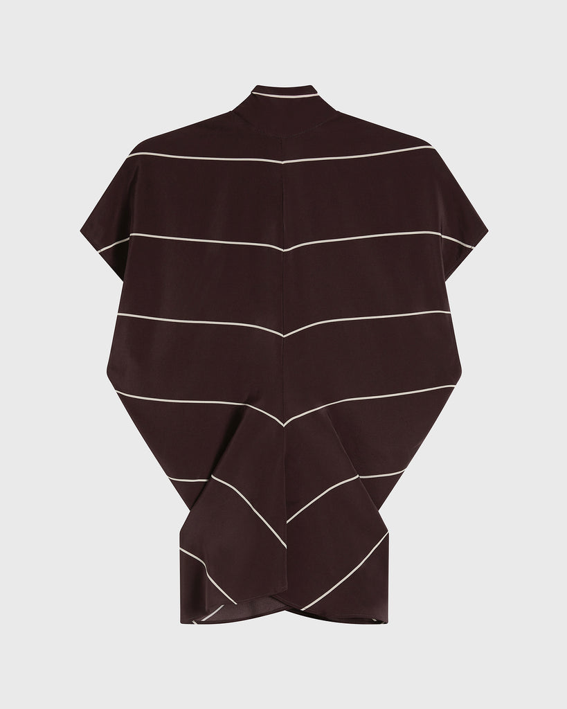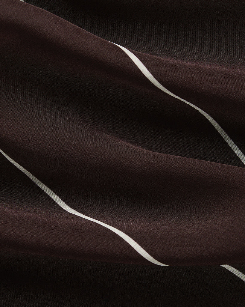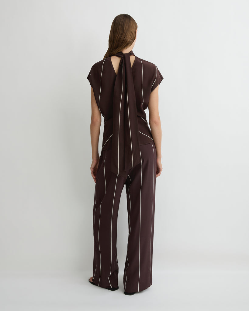 The Orta Silk Tie-Neck Top in Mocha Stripe is a refined statement piece, cut on the bias from 100% silk crêpe de Chine with a soft, fluid drape. This sleeveless silhouette features a relaxed fit and plunging V back, highlighted by a self neck tie that can be styled to the back or draped to the side. A pull-on design that balances simplicity with elegance, pairing perfectly with our matching Orta Silk Pant.