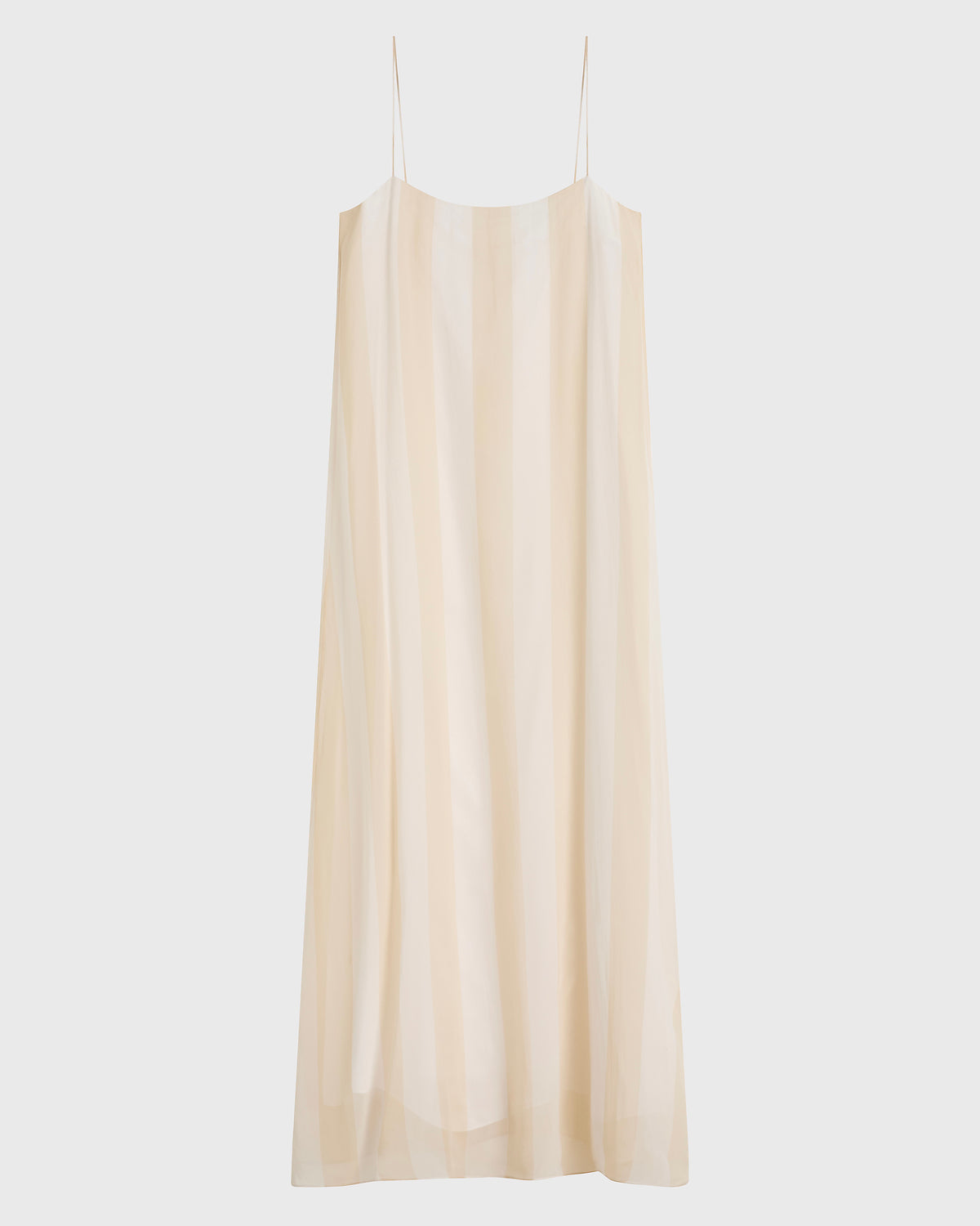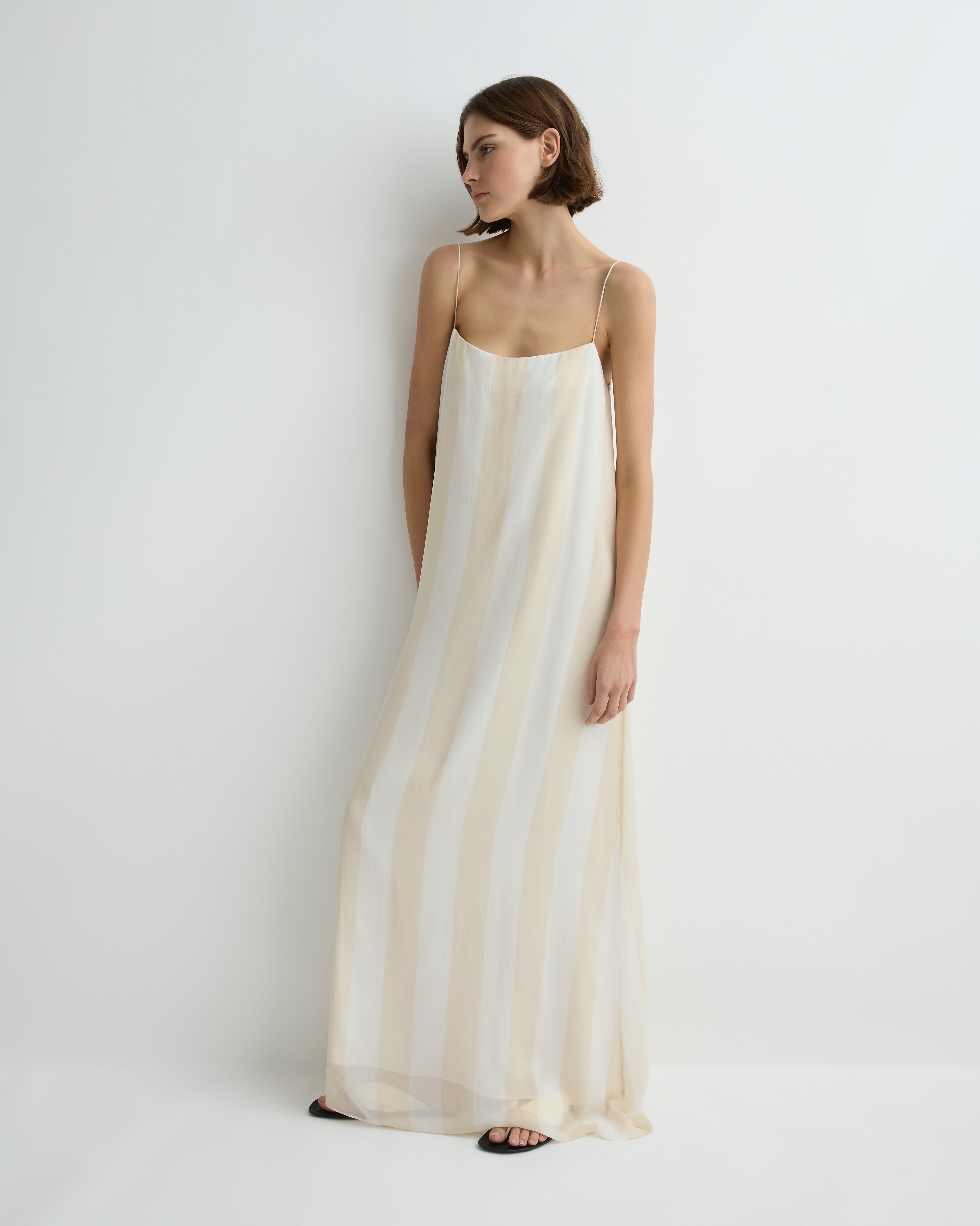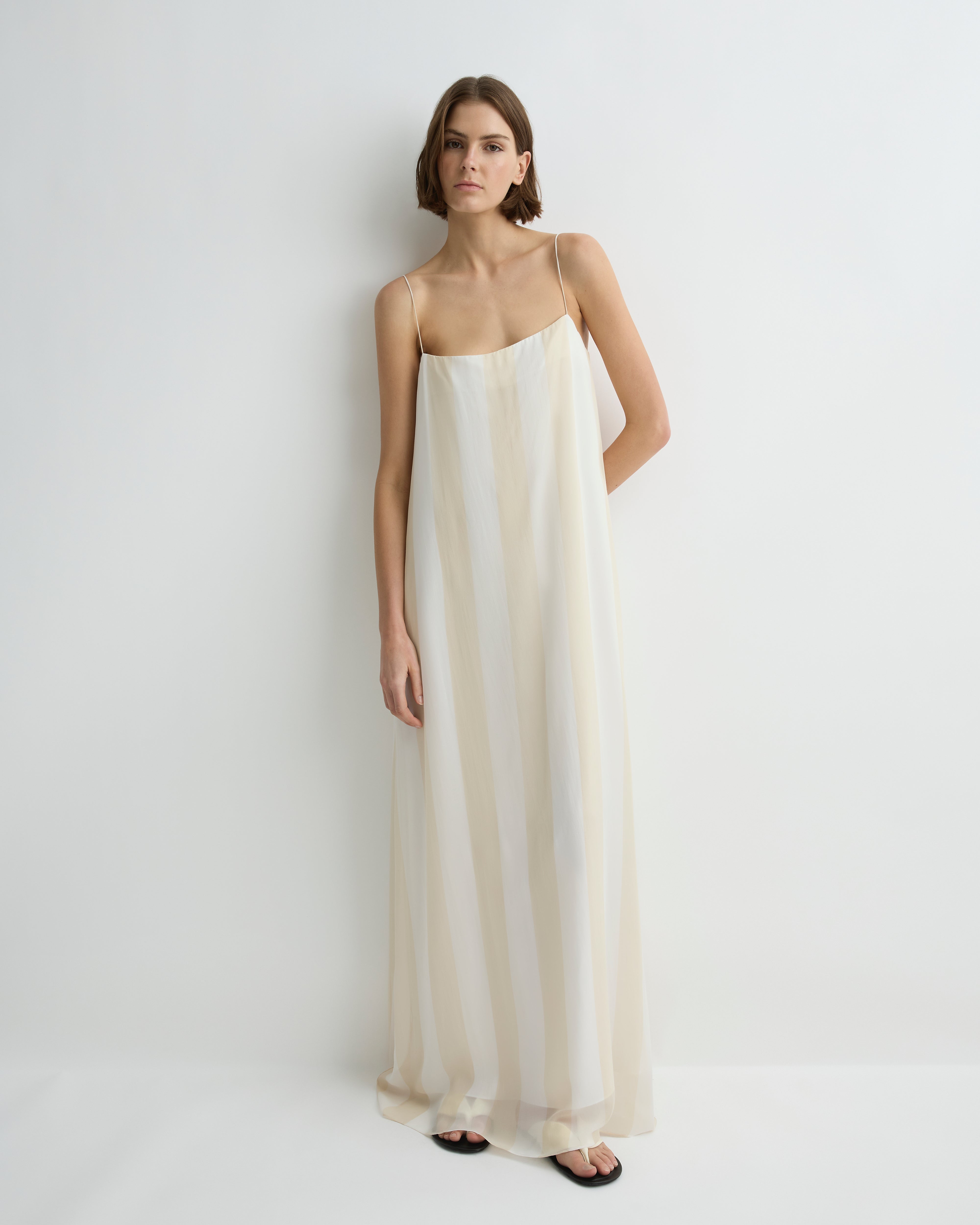 The limited-edition Capri Silk Slip Dress in ecru stripe layers a sheer silk georgette over a soft viscose twill lining for refined fluidity. Its straight neckline, long rouleau straps and floor-length silhouette create an elongating, elevated look with subtle movement and lightness.