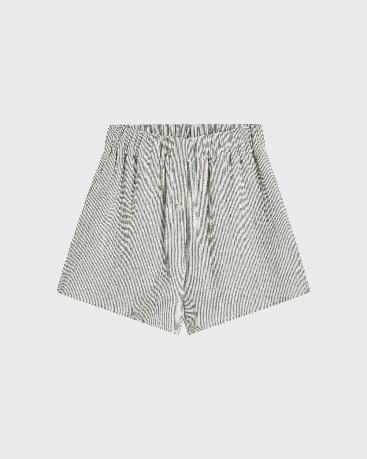 The Finn Short in leaf is a modern take on a relaxed boxer style, cut in breathable Portuguese Cotton Crinkle Stretch. Featuring a wide elastic waistband, button-fly detailing and a mini-length silhouette, it blends comfort with elevated casual styling.