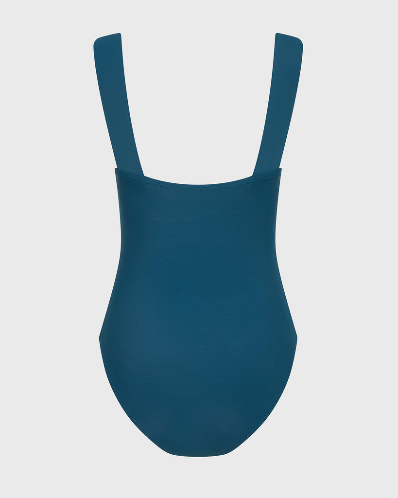 The Gwen One Piece in contemporary Tropico blue is a classic one piece that features a minimal square neckline, wide comfortable straps, invisible under-bust support, removable cups and flattering gathers at the side bust. Gwen is made using our technically advanced Sculpteur® fabric with 3-D stretch, that flatters the silhouette. Gwen offers regular bottom coverage, tummy control and ample support for larger bust sizes up to DD+. Gwen features internal openings compatible with mastectomy cup inserts.