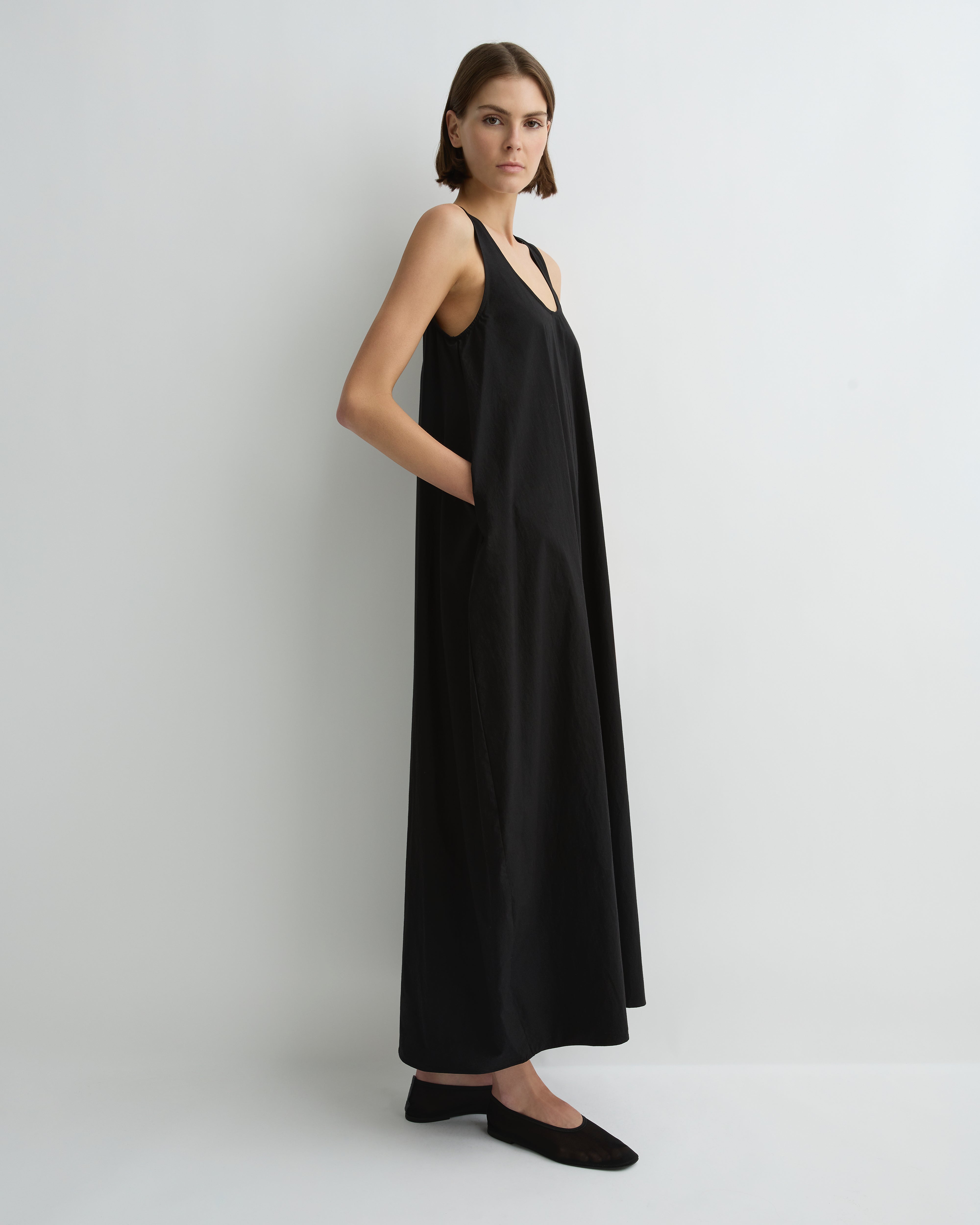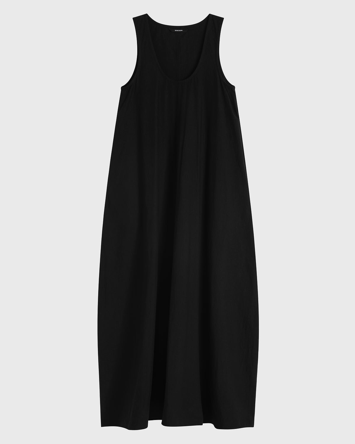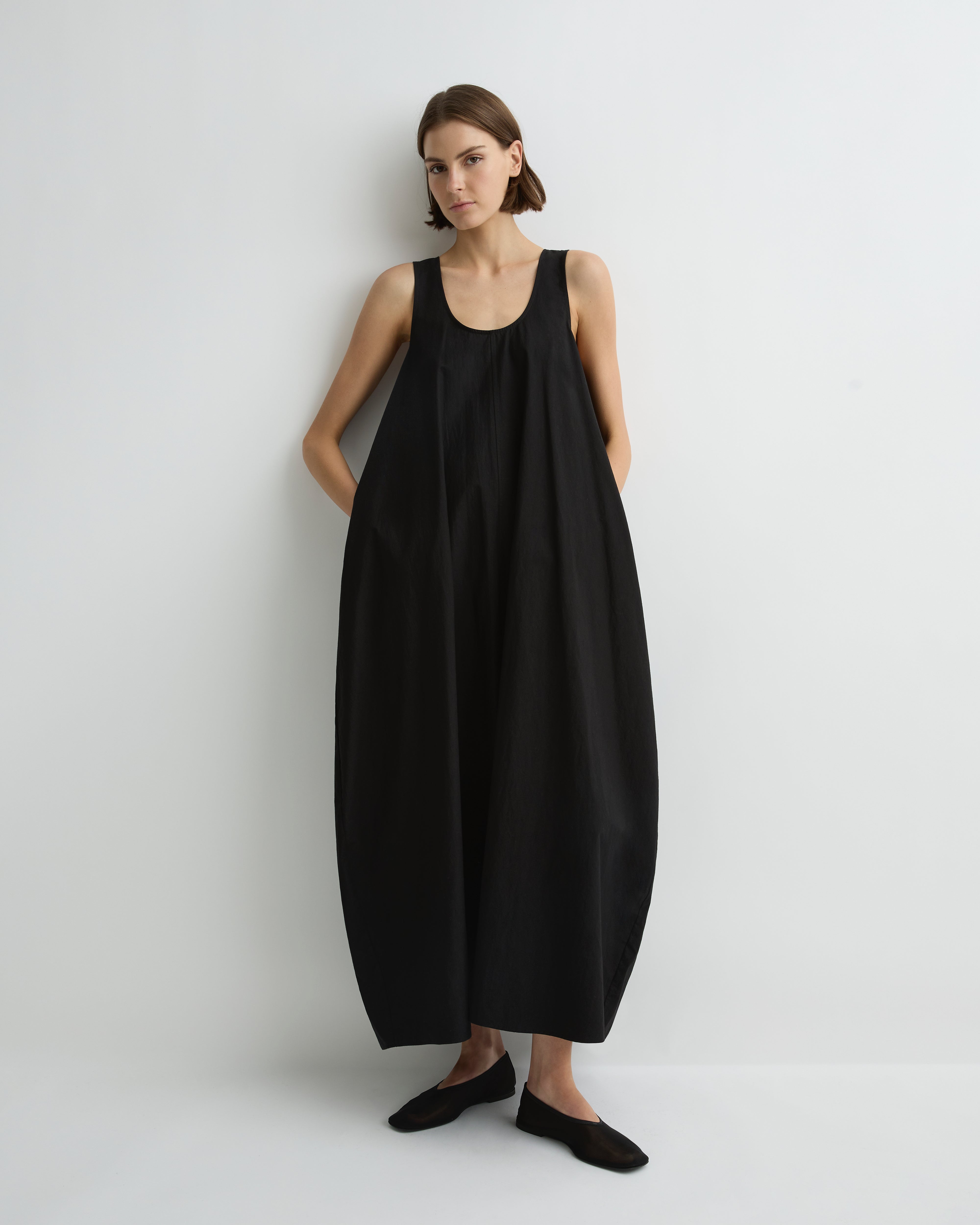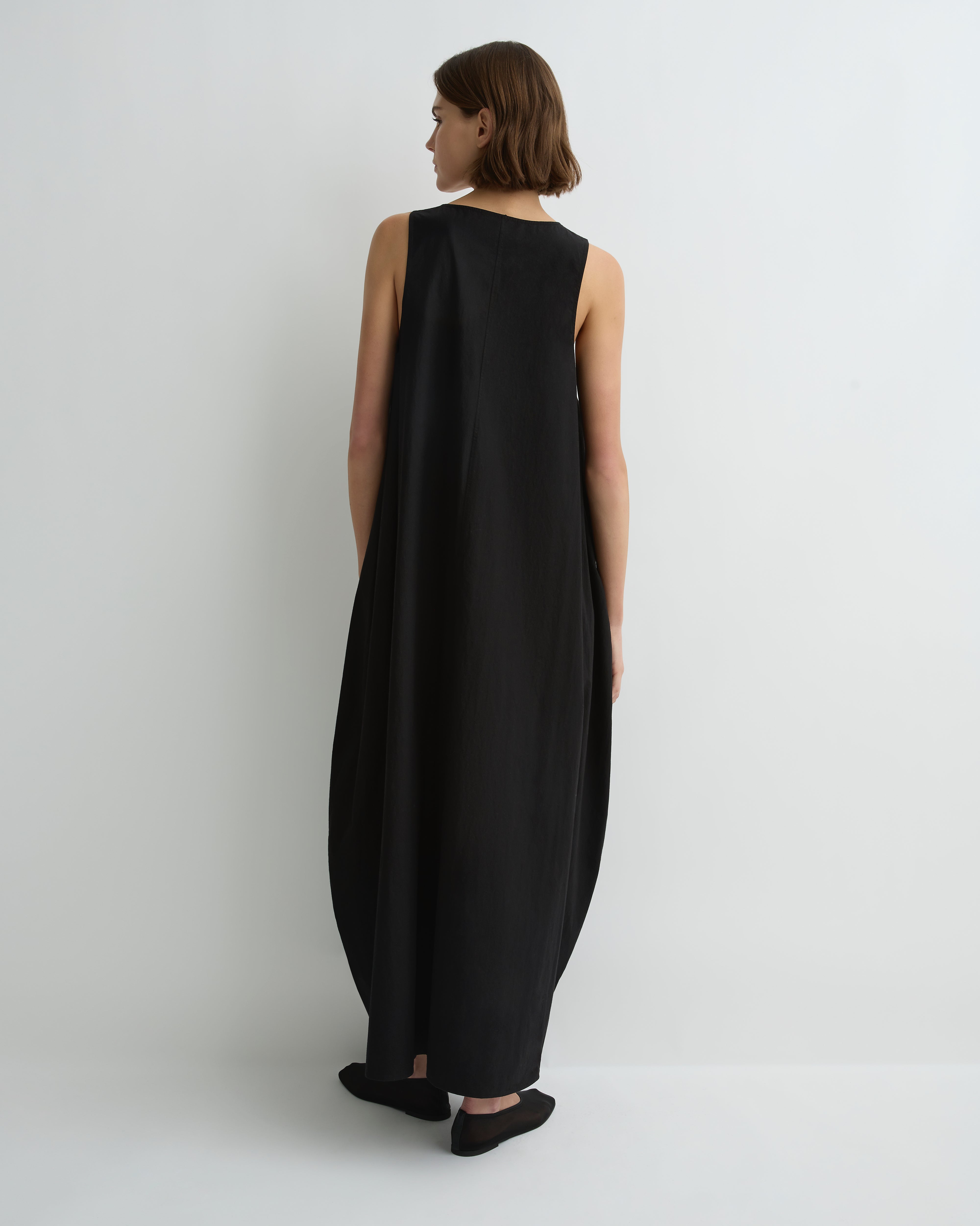 The limited-edition Kyoto Cocoon Dress in black is crafted from structured Japanese Dry Cotton, creating a sculptural silhouette that remains breathable and lightweight. With clean panel detailing, side seam pockets and an ankle-length finish, it delivers modern minimalism with architectural ease.