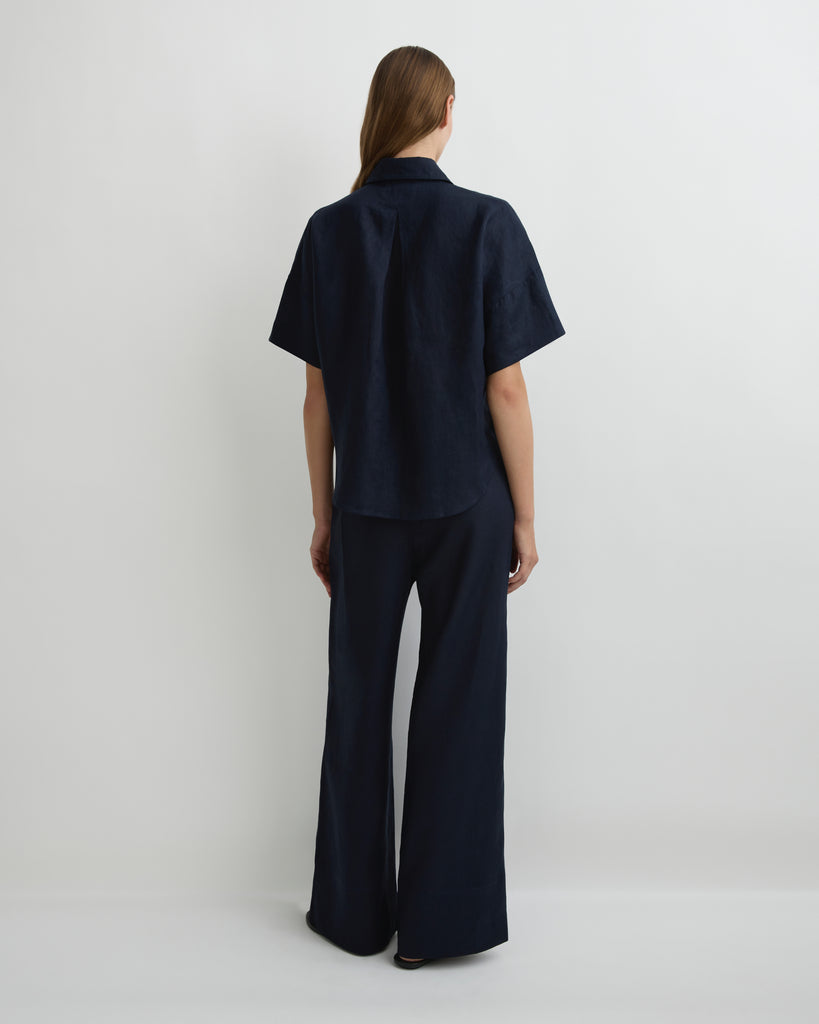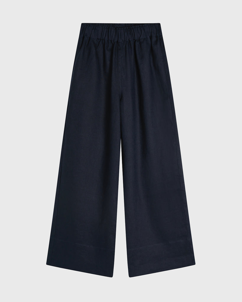 The Leiden Universal Pant in Navy is a versatile wardrobe essential, cut from lightweight linen repurposed from deadstock fabrics. Designed with an extra-wide elasticated waistband, this relaxed silhouette falls to a wide leg with a deep hem cuff for subtle structure. Finished with discreet side pockets, it offers both comfort and polish. Pair with the Leiden Short Sleeve Shirt for an effortlessly refined summer set.
