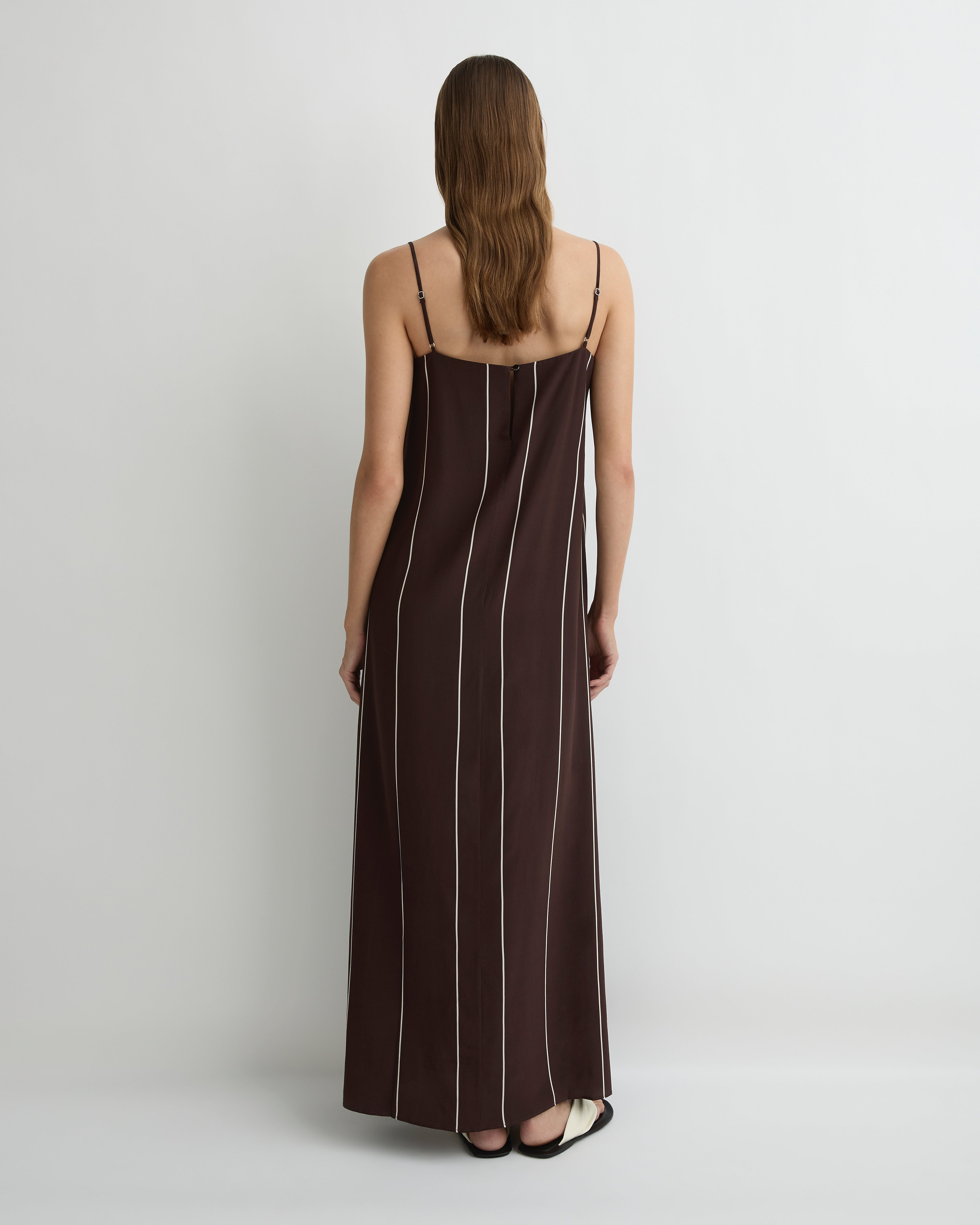 (Tariffs and duties included)The Orta Silk Slip Dress in Mocha Stripe is a refined resort silhouette, cut from 100% silk crêpe de Chine with a soft, fluid drape. This A-line design features a trapeze shape that falls into a lightly flared body, suspended from fine rouleau straps and finished with a single gunmetal shank button at the back. Effortless and versatile, it can be styled for day or elevated for evenings.