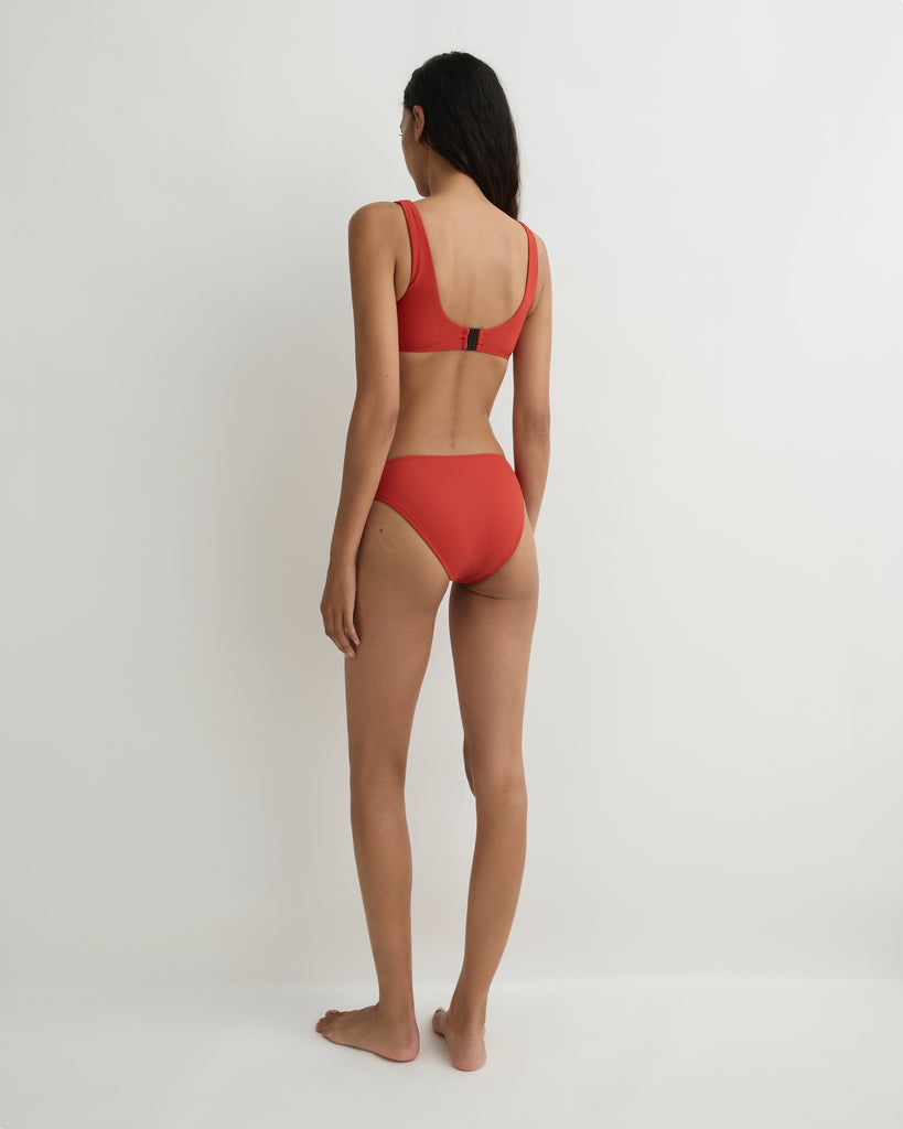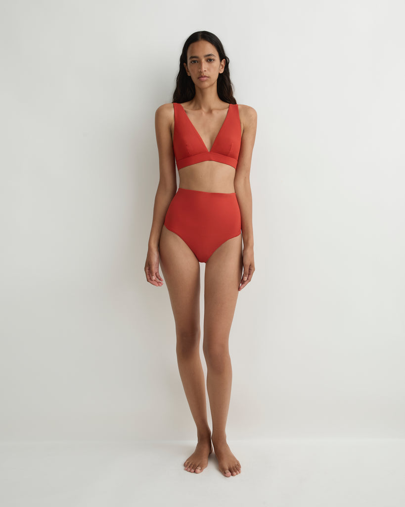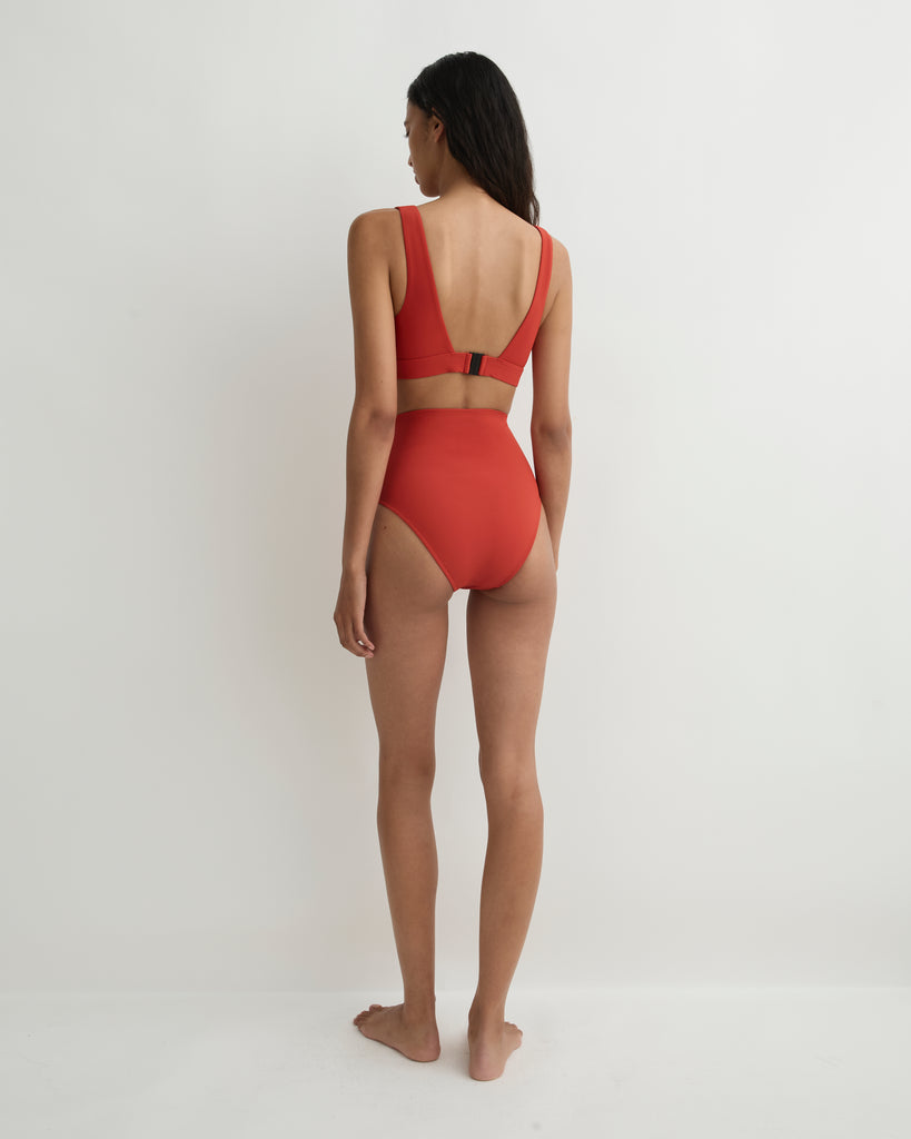 The Faith Bikini Bottom in Rosso is a super high-waisted style that sits well above the natural waist, elongating the legs and offering regular bottom coverage. A soft top edge lets you wear it high for maximum tummy coverage or fold it down for a lower rise. Crafted from our luxury Sculpteur® fabric, sustainably made in Italy, this vibrant deep-red style smooths and shapes for a flattering fit.