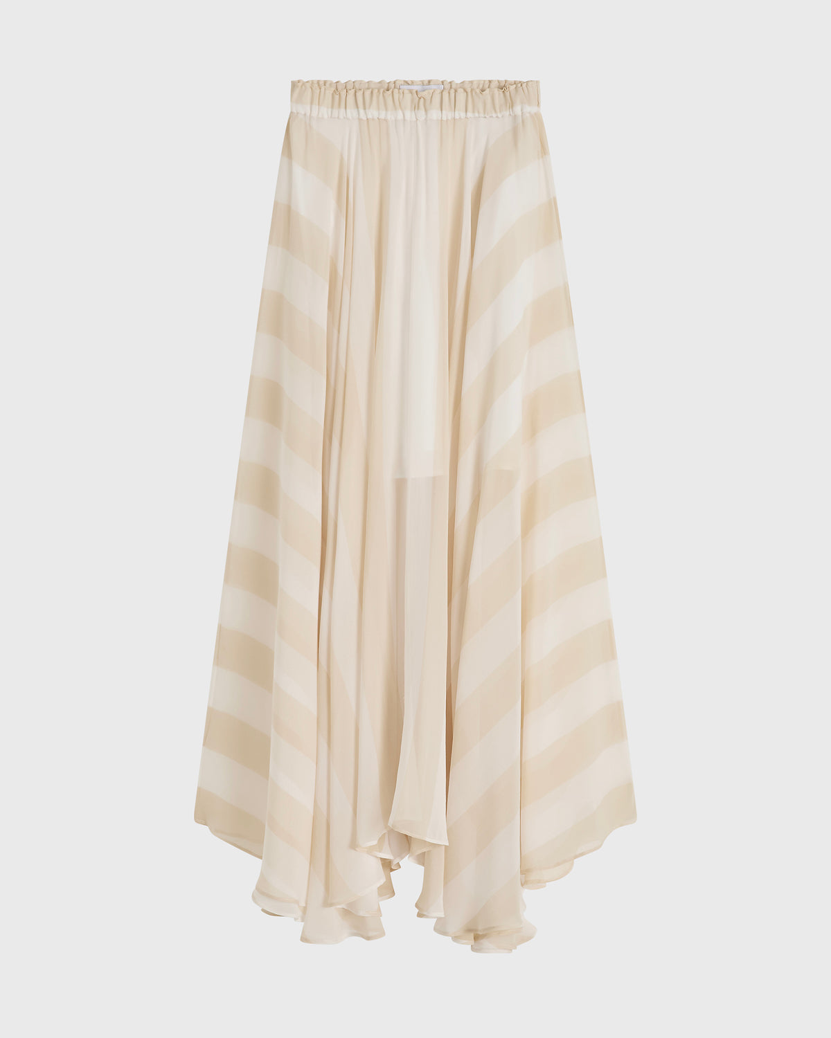 (Tariffs and duties included)The Capri Silk Circle Skirt in ecru stripe delivers dramatic, weightless movement in a full-circle cut. Crafted in sheer silk georgette and lined with a soft viscose slip, this floor-length silhouette embodies refined, effortless elegance.