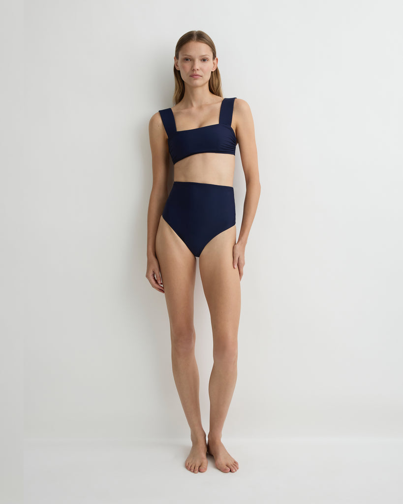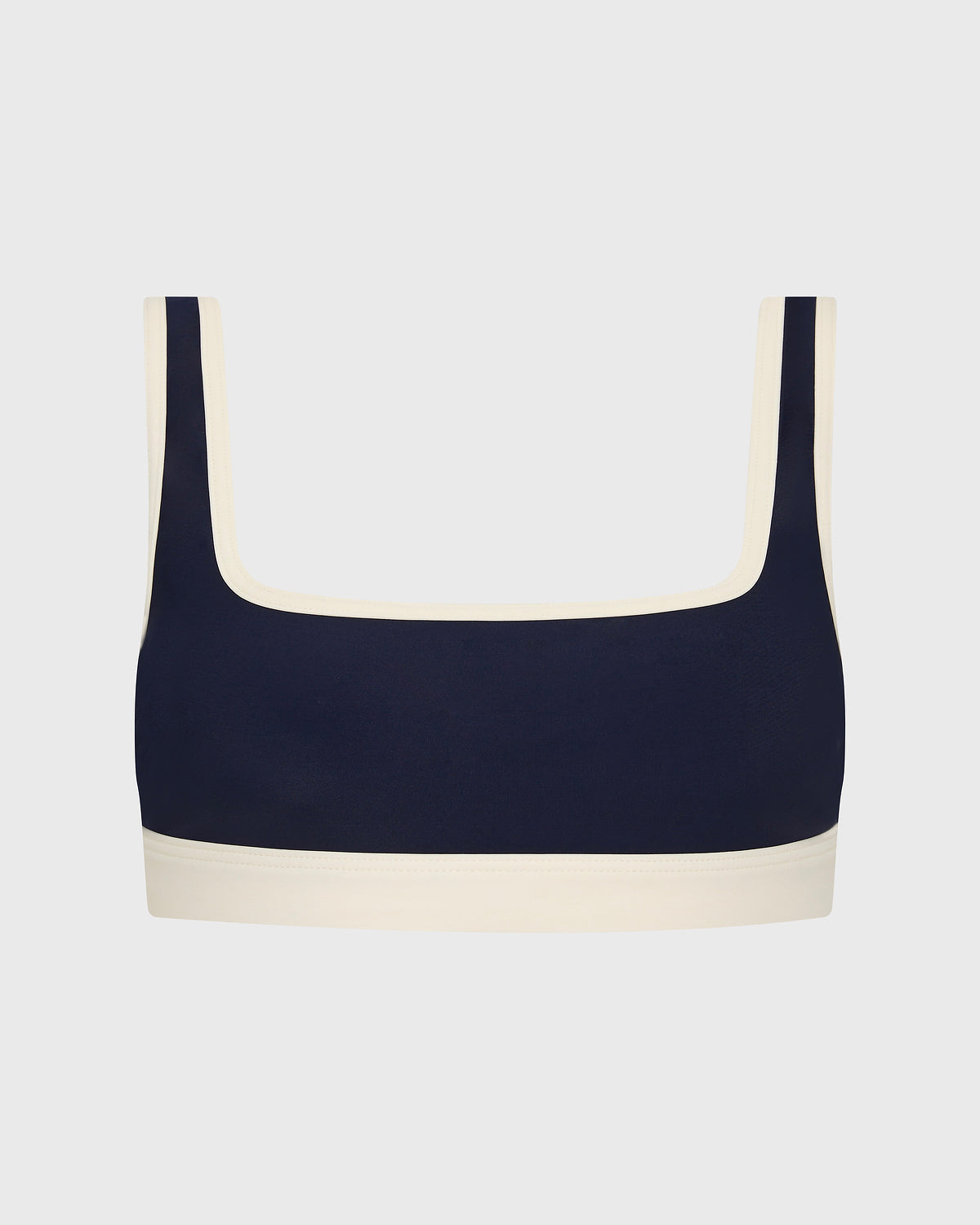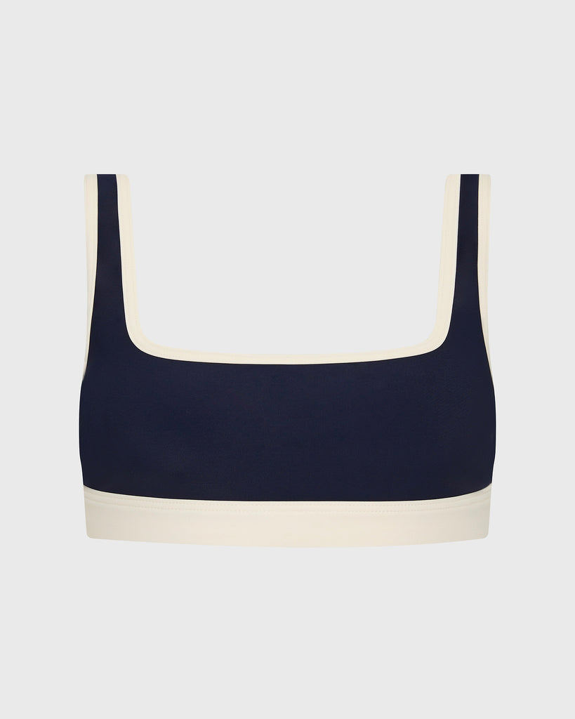 The Hayden bikini top in Navy & Pearl has a chic, classic square neck that features contrasting bind in creamy Pearl. Hayden is made using our technically advanced Sculpteur® fabric with 3-D stretch, that supports the bust. The bikini top features invisible under-bust support. The back has a V line and a branded clip. Style Hayden with our matching Jayde Bikini Bottom in Navy & Pearl.
