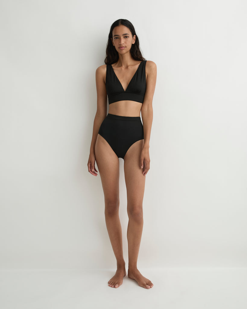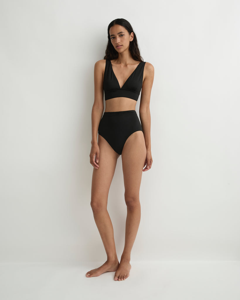 The Ivy Bikini Bottom in Black is a minimal low rise bikini bottom with a subtle scoop front. Ivy offers regular bottom coverage and can be worn on the hips or pulled high. Ivy is made using our luxury Singuleur® fabric that will time times longer than standard swim fabrics.